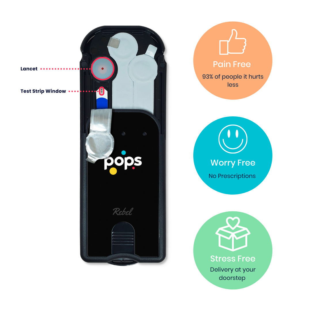The Pops Rebel Glucose Meter is one of the most discreet, easy to use glucose meters available. It is 100% accurate to FDA Standards, connects via bluetooth to your phone and is proven to lower your A1c. It's Time to Own Your Life® with Pops.