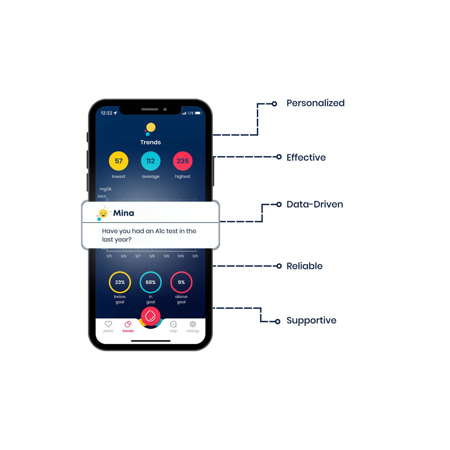 By building self-efficacy, Mina helps individuals overcome barriers and increase their motivation for positive behavior changes. With Mina's guidance, individuals can set realistic goals, make informed decisions about their diet, exercise, and medication, and confidently sustain healthy lifestyle changes that lead to improved A1c levels.