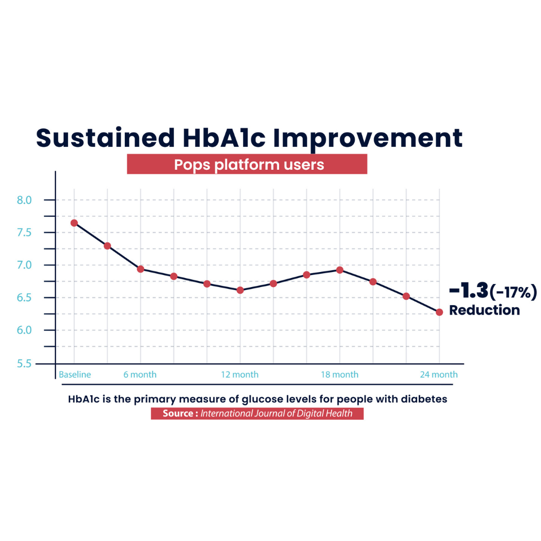 Published in the International Journal of Digital Health, this Pops clinical study showed a total population 17% reduction in A1c from 7.7% to 6.6%. Almost half of the population demonstrated a 33% reduction in their A1c. Pops’ simplicity enables more people to reduce their A1c.