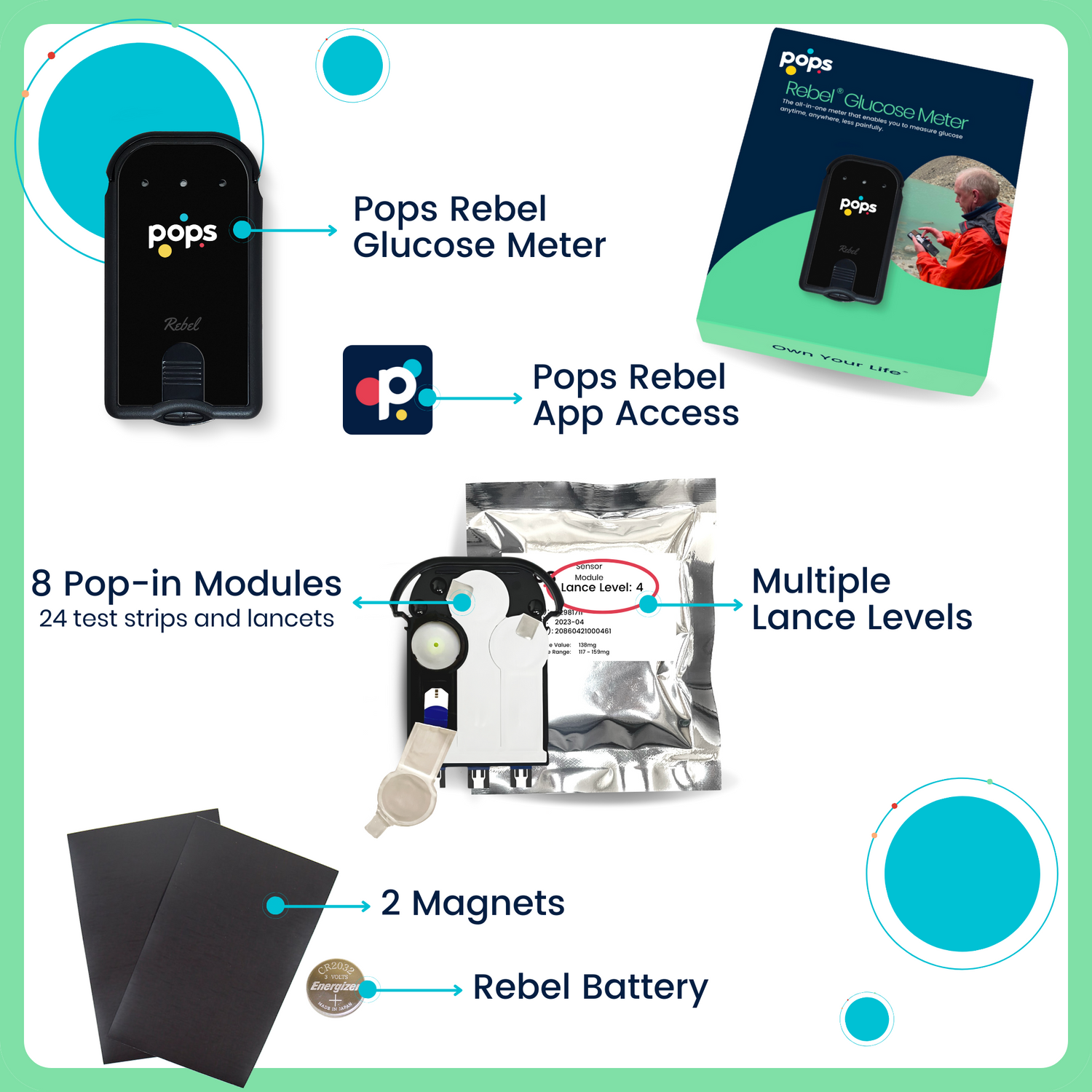Whether you're hiking in the mountains, running a marathon, or just living your everyday life, the Pops Rebel Glucose Meter is your ultimate companion. It's sleek, all-in-one design makes it easy to test anywhere, at any time.